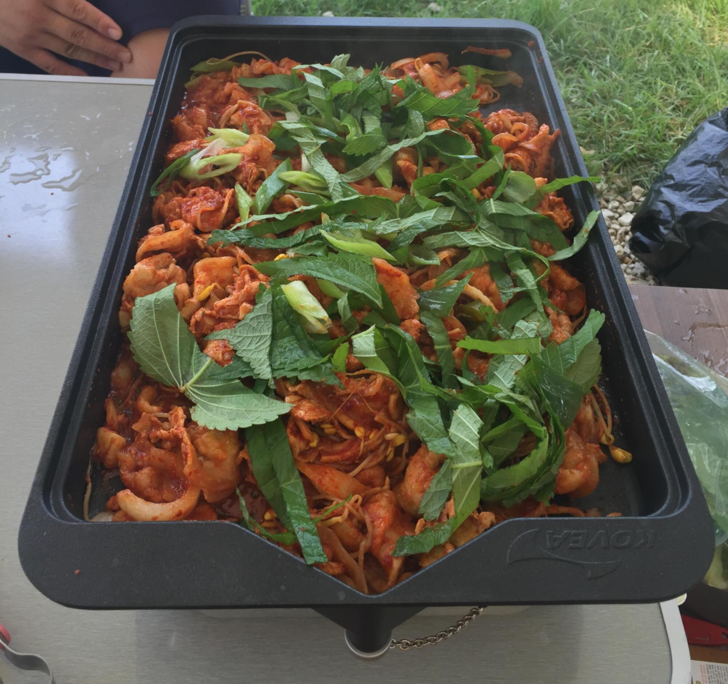 사이트 구축이 힘들었기에 시원한 맥주와 함께 잠시 여유를 즐겼습니다. 오늘의 저녁 메뉴는 '오삼불고기'. 오징어와 삼겹살 넣고 미리 준비해둔 양념을 넣은 후 콩나물 넣고 볶기 시작하면 맛있는 냄새가 퍼집니다. 어느 정도 익으면 깻잎을 찢어 넣어 향을 더합니다. 완성된 '오삼불고기'를 상추와 깻잎에 싸서 입에 넣으면 세상 행복한 맛입니다. 오삼불고기 한점, 맥주 한 모금, 오삼불고기 한점, 맥주 한 모금을 반복하며 먹어줍니다. 마지막 메뉴로는 볶음밥, 한국사람이라면 볶음밥은 꼭 먹어줘야 합니다. 남은 양념에 밥과 참기름, 김을 넣고 볶아주면 볶음밥 완성! 이미 배부르지만 숟가락을 들어 볶음밥 앞으로 전진!