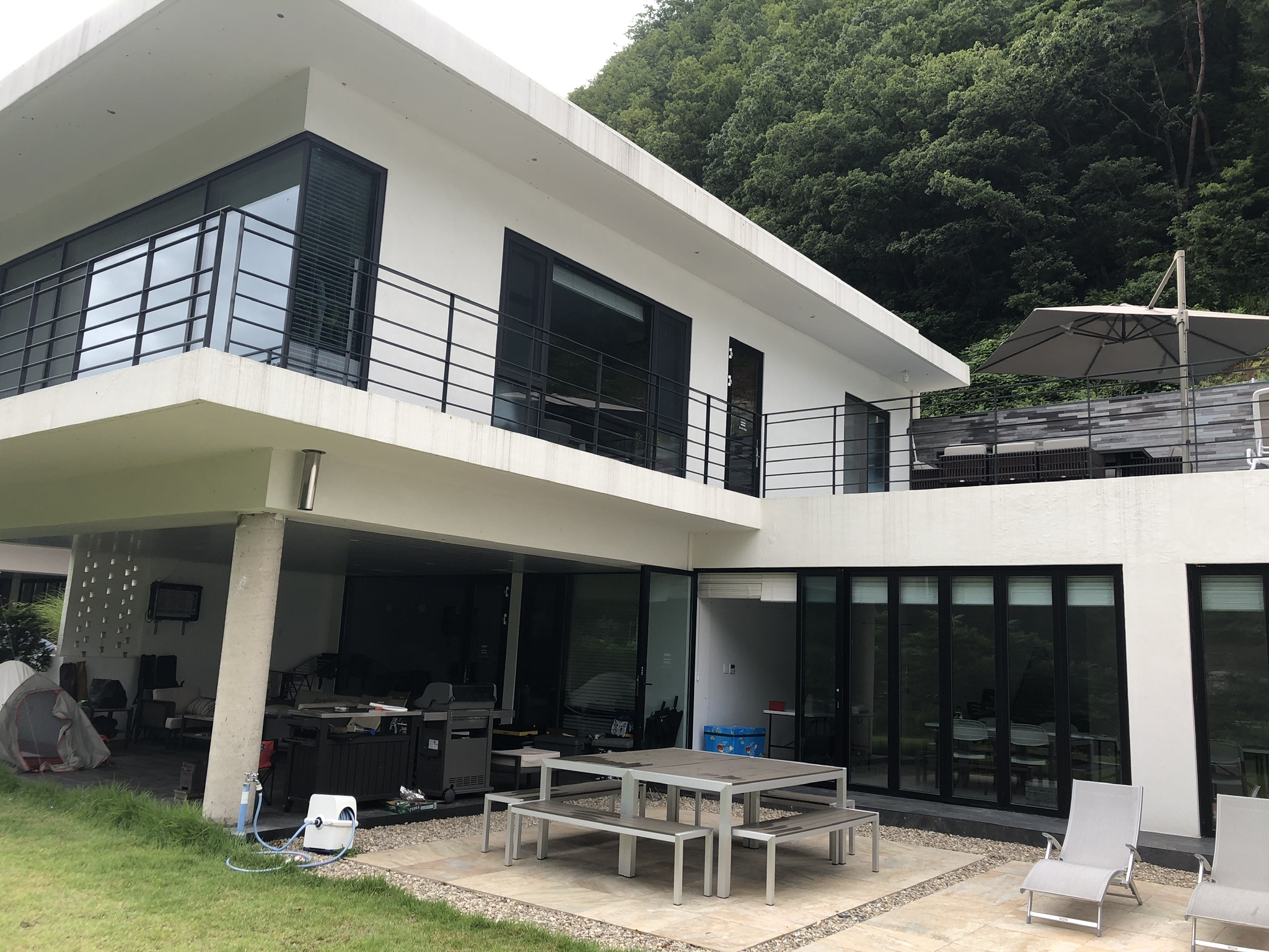 거실 및 주방, 메인 침실이 자리한 2층은 전면 유리창으로 시원한 리버뷰가 펼쳐 저 있고, 거실과 긴 식탁을 창 앞에 배치해 머무는 시간 동안 전망을 마음껏 감상할 수 있습니다. 2층 침실 옆 욕실 겸 프라이빗 스파룸이 위치해 있는데 야외 테라스와 이어져 있어 수영장과 스파룸을 쉽게 오갈 수 있습니다. 수영을 즐기고 나면 물이 흐르는 채로 현관을 지나 들어가야 하는 단점이 있는데 이곳은 바로 화장실과 연결되어 있어 다른 영역을 오염시키지 않고 들어갈 수 있습니다.