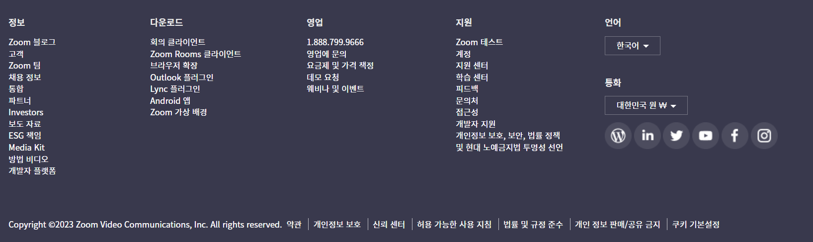 2. 홈페이지 메인에서 스크롤을 제일 하단까지 내리면 아래와 이미지에 나온 것처럼 정보, 다운로드, 영업, 지원 카테고리가 보입니다. 여기서 우리가 클릭해야 하는 건 바로 다운로드 메뉴에 회의 클라이언트입니다.
