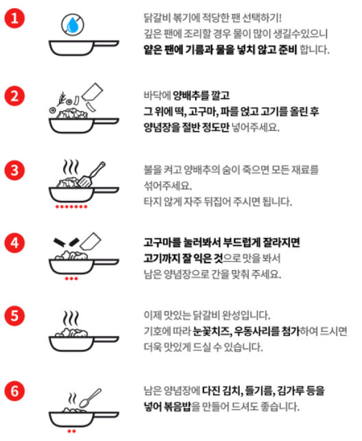 닭갈비+깻잎, 대파, 떡, 고구마+양념소스+양배추 구성으로 배송 후 바로 볶아 먹을 수 있게 구성되어 있습니다.