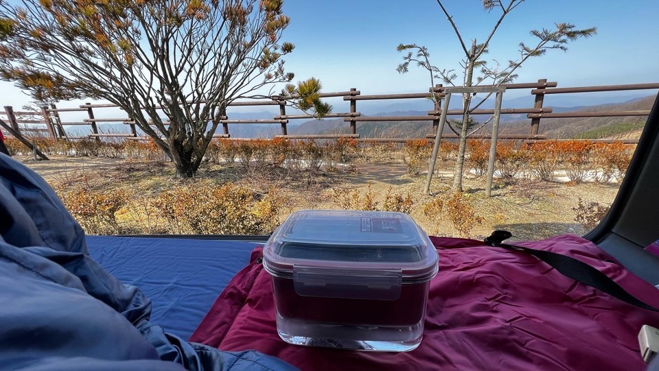노지에서 차박을 할 땐 공간을 최대한 확보하고 가야 해서 캠피 용품을 최소화합니다. 작은 아이스박스여도 자리를 차지해서 저는 위에 설명드린 것과 같이 내용기에 음식 넣고 외용기에 쿨링팩 넣어 발열 가방 안에 다 넣어서 챙겨갑니다.