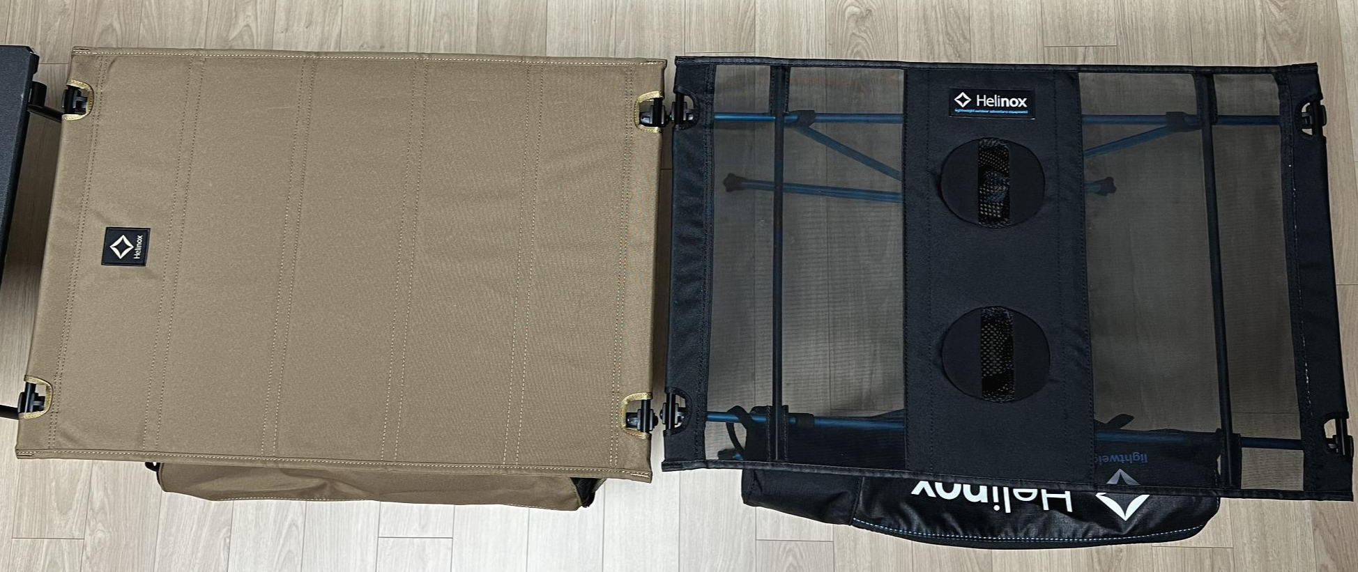 테이블 원은 매쉬(mesh) 소재라 부피가 적게 차지하는데 이에 비해 택티컬 테이블 엠은 패드가 들어있어 테이블 원 보다 부피가 좀 더 큰 편입니다.